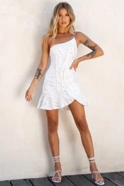 Turn heads in our gorgeous Eiza dress. Featuring the prettiest sequin embellishment detail throughout and a hot one-shoulder style. Perfect for a bridal shower or special occasion teamed with strappy white heels and a clutch. Cute!