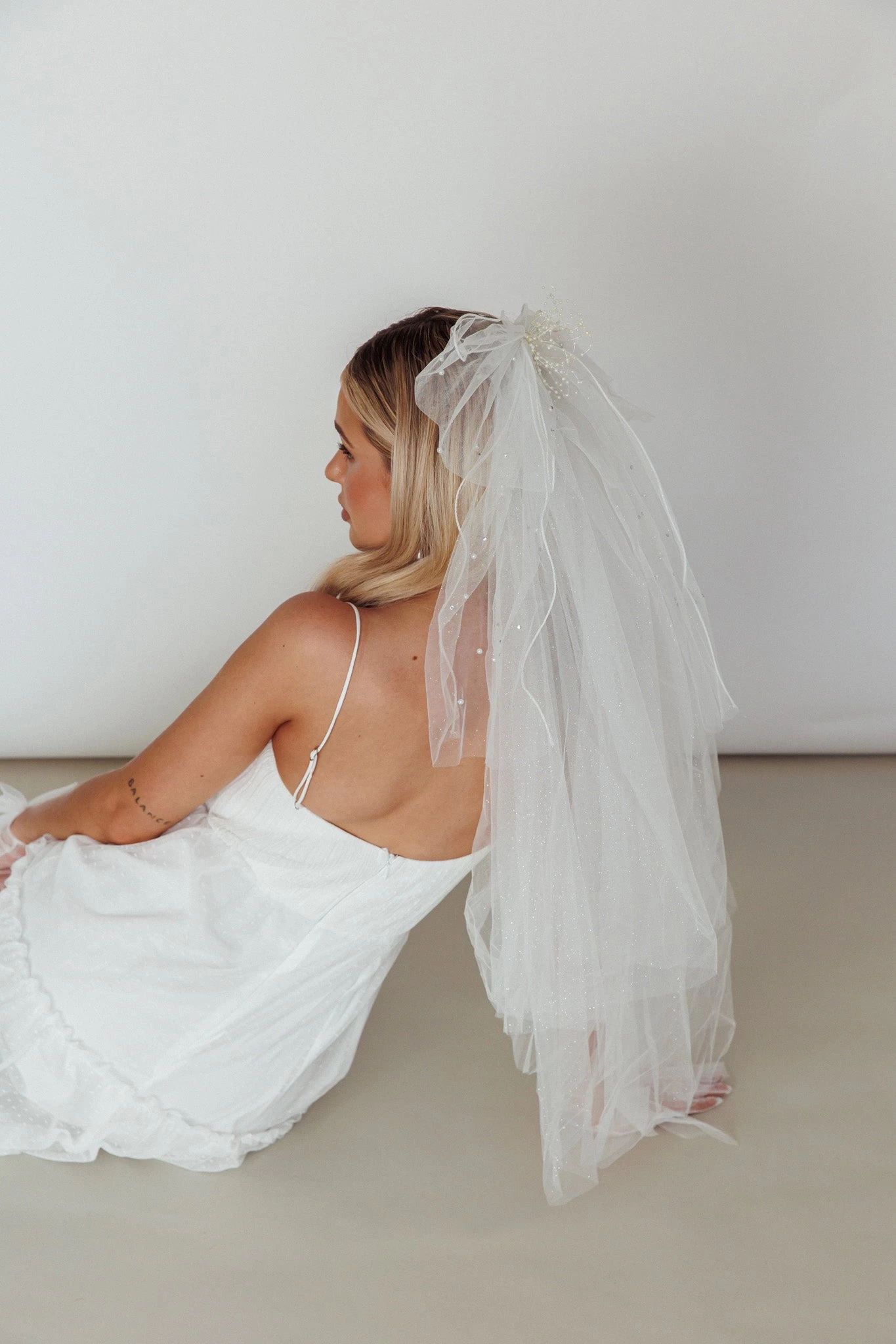 Complete your wedding day look with our gorgeous Isa veil. We are in love with the glitter and pearl embellishment detail. Team it with our Marietha dress and Odette earrings for an unforgettable look.