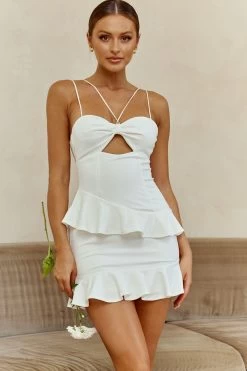 Your closet called, it needs this dress! It’s easy to see why, with its strappy bust detail and ruffle trim accents. Perfect for a bridal shower or birthday celebration. Team it with white, strappy heels and a silk clutch for a look we are loving.