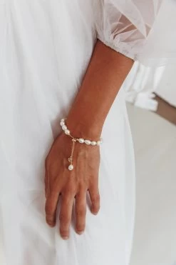 Our Sharie bracelet is just what you need to complete your bridal look. Featuring a classic, baroque, faux pearl and gold beads. Team it with pearl earrings and a satin clutch for an unforgettable look.