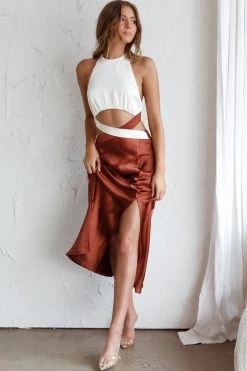 You’ll cause quite the commotion in our hot Social Butterfly midi dress. Featuring a cut-out waist and sexy thigh split. Perfect for a birthday celebration teamed with strappy tan heels and a small purse.